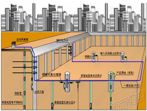 其次、地下连续墙和横向支撑的钢筋应力、混凝土应变。轴支撑的压力监测、周围锚索的拉力都是基坑监测不可忽视的因素。